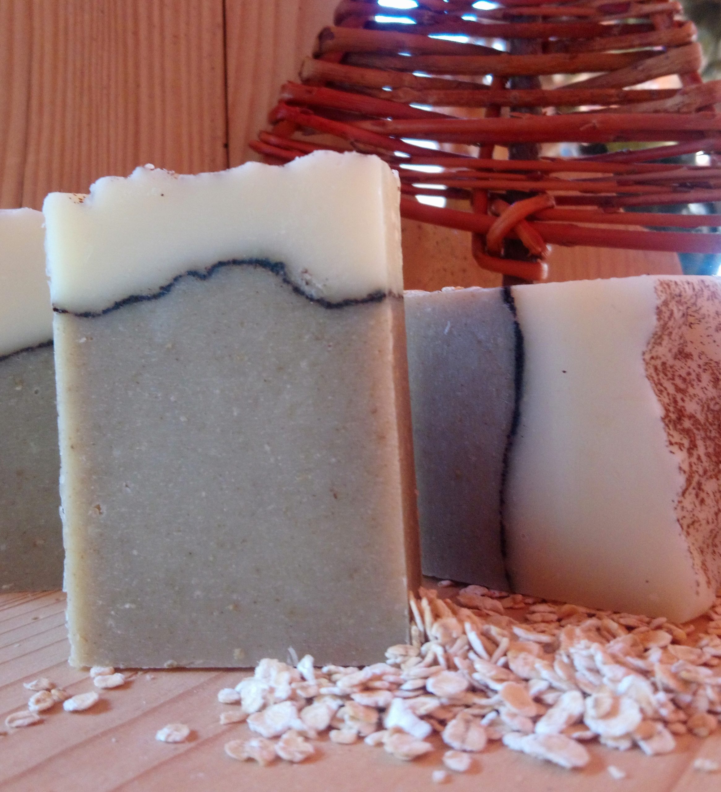 Savon surgras formulé à partir d’huiles végétales (tournesol*, karité* et coco*) et d’argile blanche, de poudre de guimauve*, de flocons d’avoine* et de poudre de badiane*
