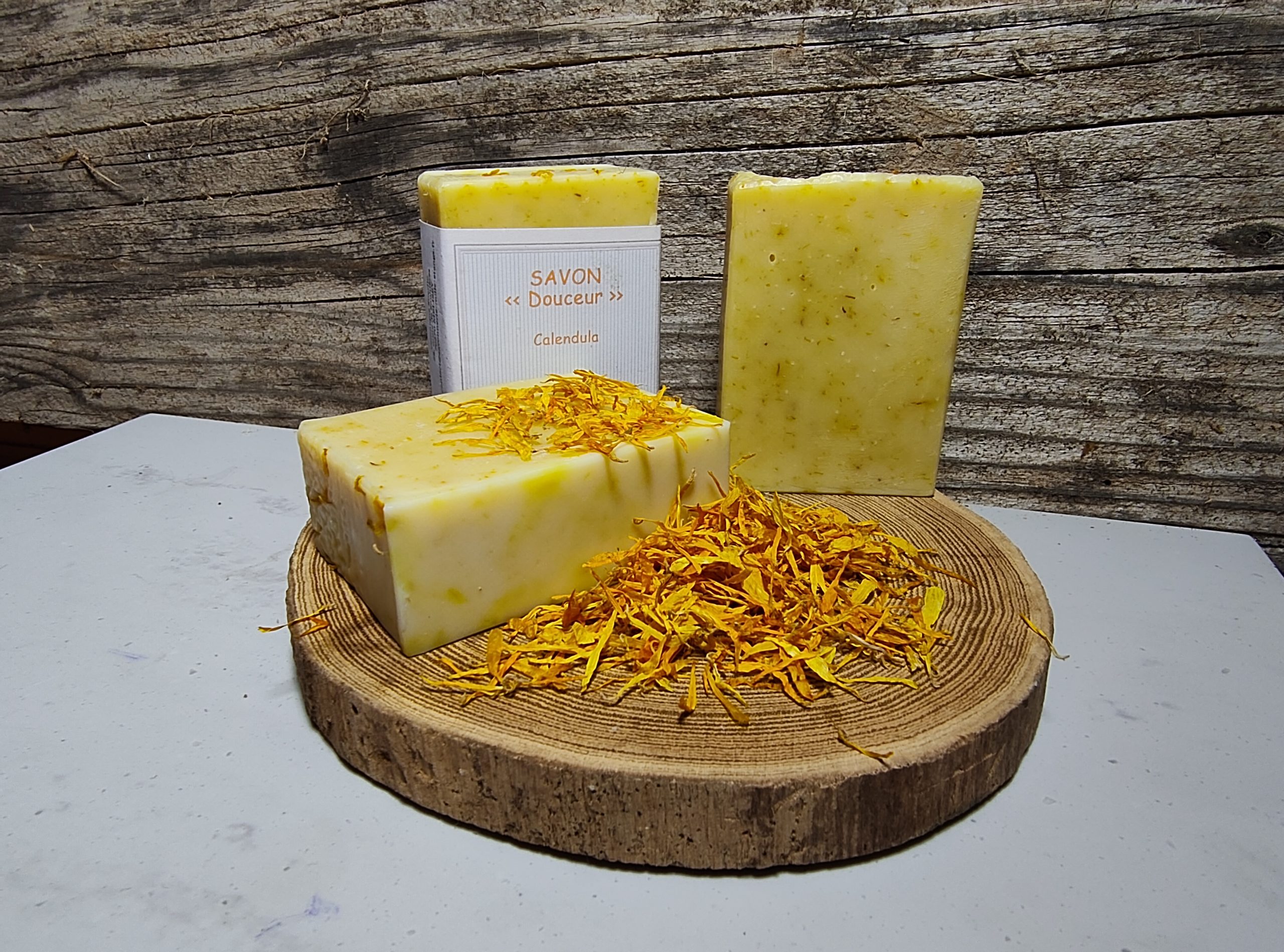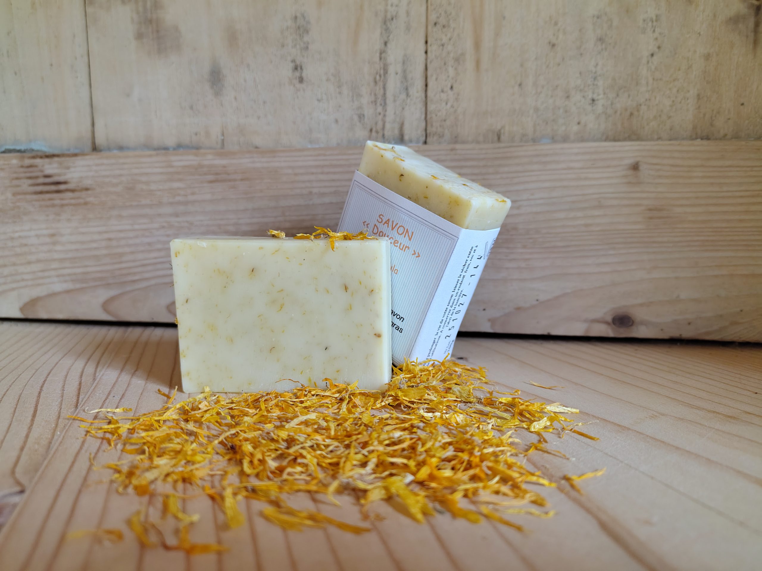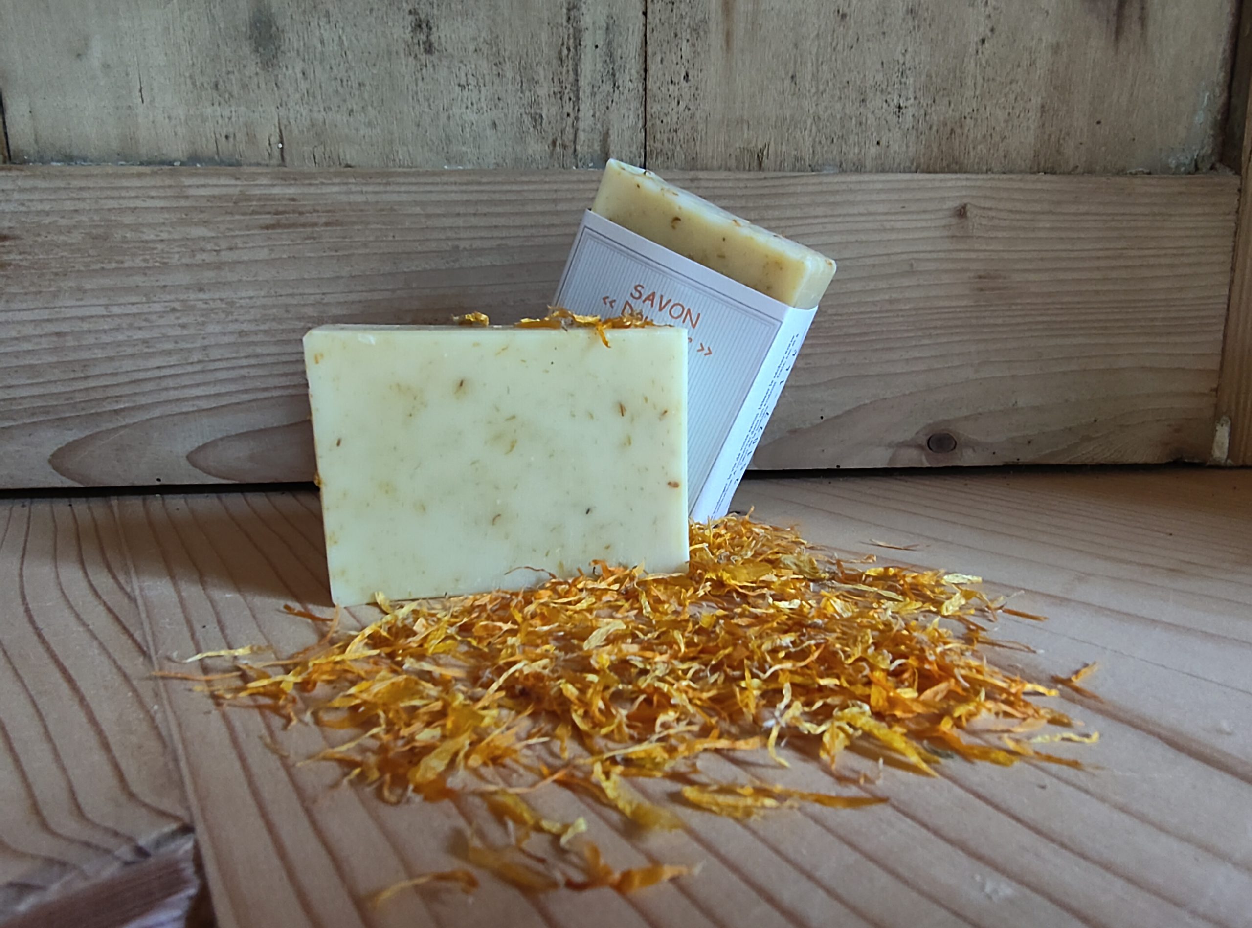 Savon surgras formulé à partir d’huiles végétales (olive*, coco* et tournesol*) et de pétales de calendula.